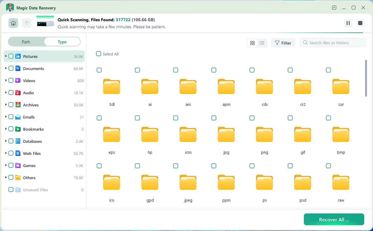 Doba potřebná ke skenování disku se liší podle jeho kapacity a zaplnění daty. Výsledkem je kompletní přehled souborů k obnově, ve kterém můžete po přepnutí na kartu „Type“ vyhledávat smazané soubory podle jejich typu a konkrétního formátu.