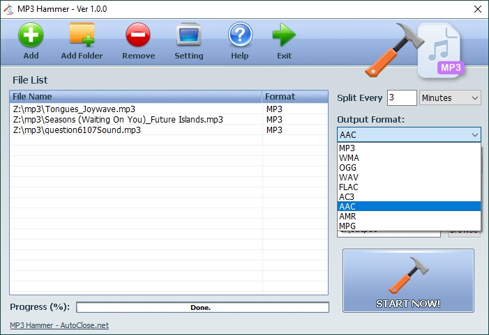 Široká podpora vstupních formátů předurčuje MP3 Hammer i pro jeho použití jako rychlého audiopřevodníku. Jen je potřeba záměrně nastavit dlouhý čas dělení, aby výstupní soubory byly převedeny v plné délce.