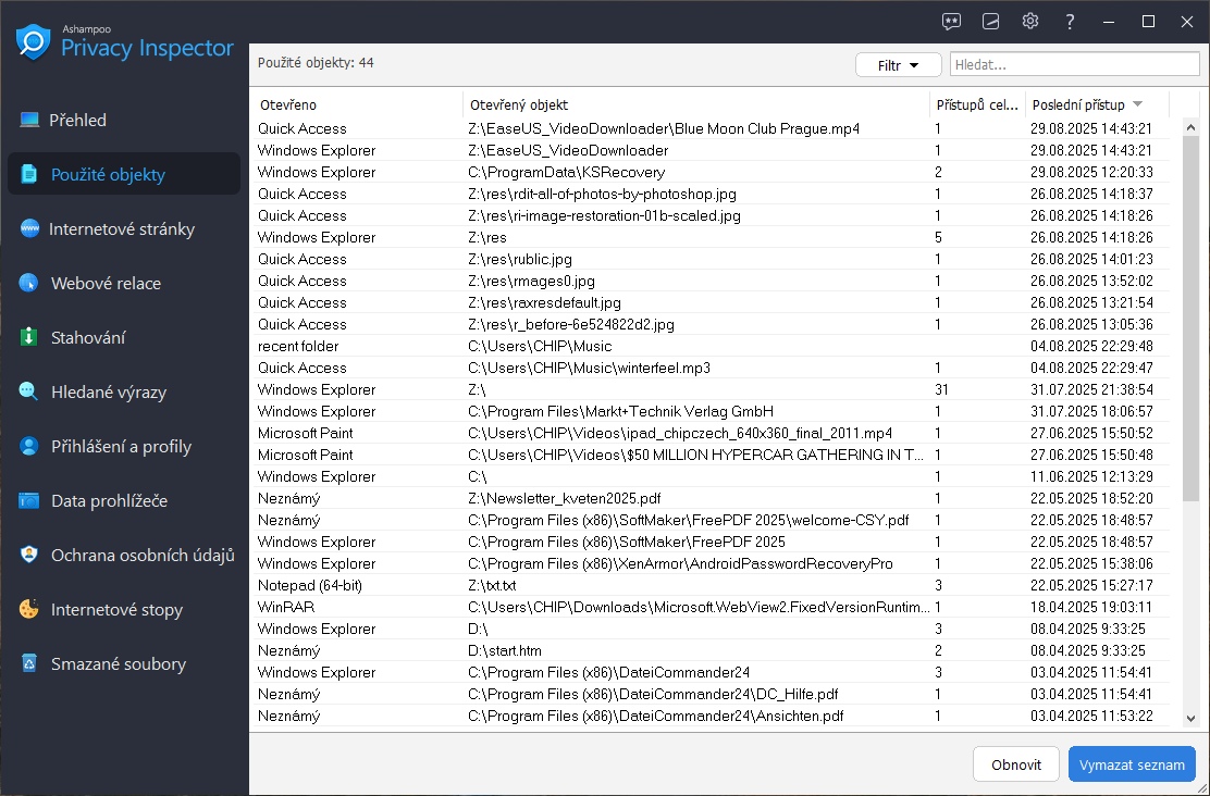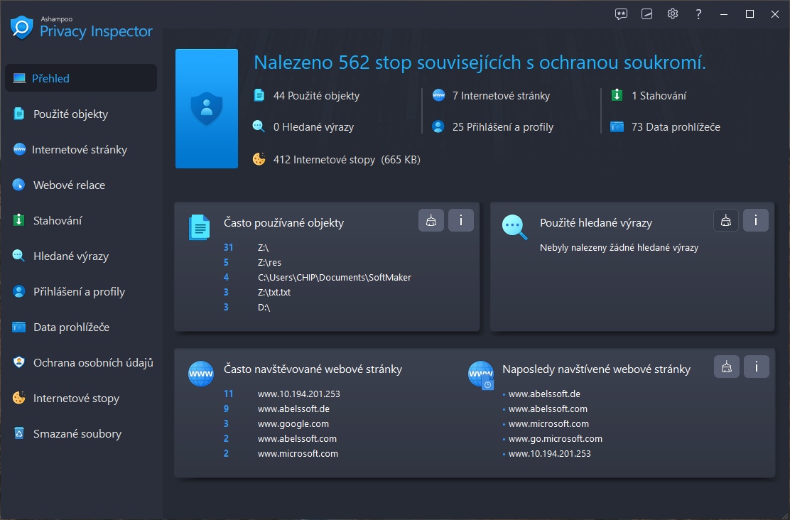 Ashampoo Privacy Inspector je výkonný nástroj pro odhalení a správu digitálních stop, které systém Windows na pozadí zaznamenává. Program uživatelům umožňuje detailně sledovat soubory, aplikace, navštívené webové stránky, historii vyhledávání, stahování, přihlášení i formulářové vstupy.