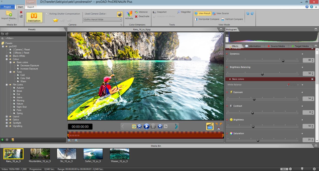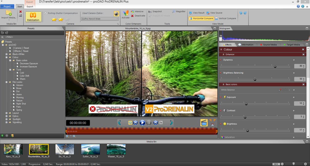 Program ProDAD ProDRENALIN V2+ Pro umožňuje editovat videa z akčních kamer klasickým způsobem na časové ose a nabízí širokou knihovnu filtrů a efektů na další úpravy videozáběrů. Vylepšeny byly nástroje na korekci barev. S úpravami vám pomohou také nastavitelné profily pro různé používané kamery nebo automatická korekce zkreslení snímacího čipu. Tato verze má schopnost zpracovat klipy s rozlišením až 8K UHD. Nové možnosti exportu formátů nabízejí formáty AVC/H.264, H.265, Apple ProRes, Motion JPEG, AVI, Canopus HQ/HQX a GoPro Cineform. Exportujte jednotlivé klipy nebo exportujte více klipů najednou pomocí dávkového zpracování.