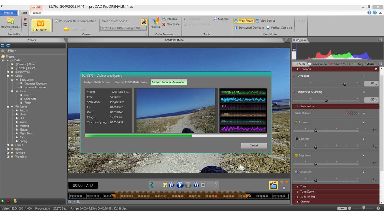 Stabilizaci videa spustíte jednoduše kliknutím na předvolbu »Stabilize Video« v nabídce »Stabilization«. Otevře se okno se znázorněním průběhu optimalizace videoklipu a pak si můžete výsledek zkontrolovat v přehrávači v hlavním okně aplikace.