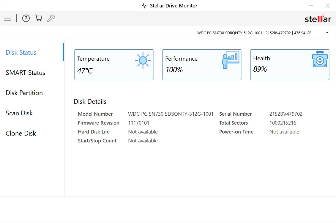 Hned ve výchozím okně „Disk Status“ zobrazuje programu Stellar Drive Monitor základní informace o pevném disku a jeho kondici. Zpozornět byste měli především v případě vysoké teploty disku (50 stupňů a více) a nízké úrovni ukazatele „Health“, tedy celkového zdraví disku.