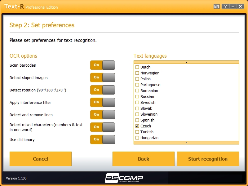V nastavení programu Text-R je nutné zvolit jazyk rozpoznávaného textu. Dále je ve výchozím nastavení aplikace aktivována například i funkce na detekování otočeného nebo křivého zdrojového obrázku nebo třeba rozpoznání textů, kdy se v jenom slově kombinují písmena i číslice.