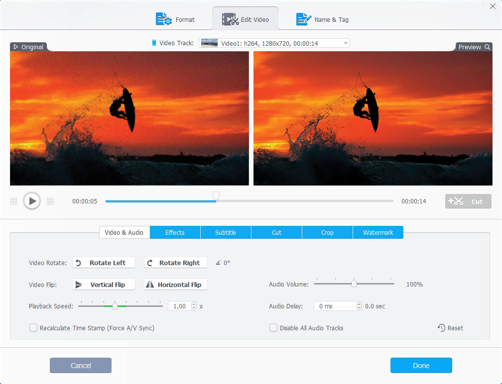 V rozděleném náhledu videoeditoru vidíte vždy originální video a obraz po aplikování úprav. Kromě obrazu můžete pracovat také se zvukovou stopou a například si také zvolit kodeky použité pro kódování obrazu a zvuku. Pokud máte videozáběrů více, oceníte i dávkové zpracování.