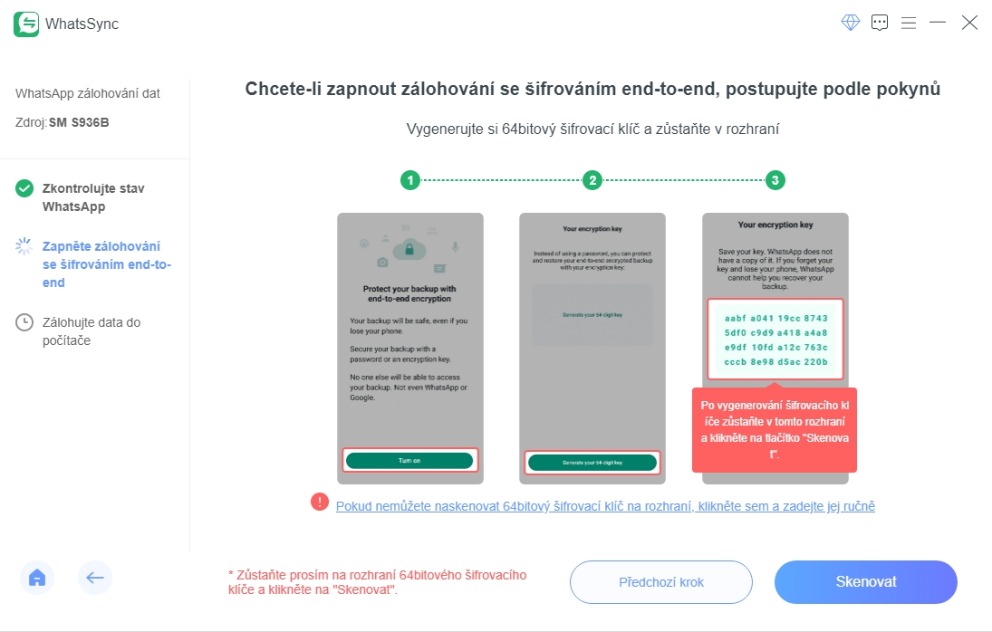 Po připojení smartphonu k počítači je nutné upravit ještě nastavení aplikace WhatsApp v telefonu. Aiseesoft WhatsSync vás ale provede všemi postupnými kroky, abyste mohli následně zálohovat všechna data do počítače nebo je přenést do jiného telefonu.