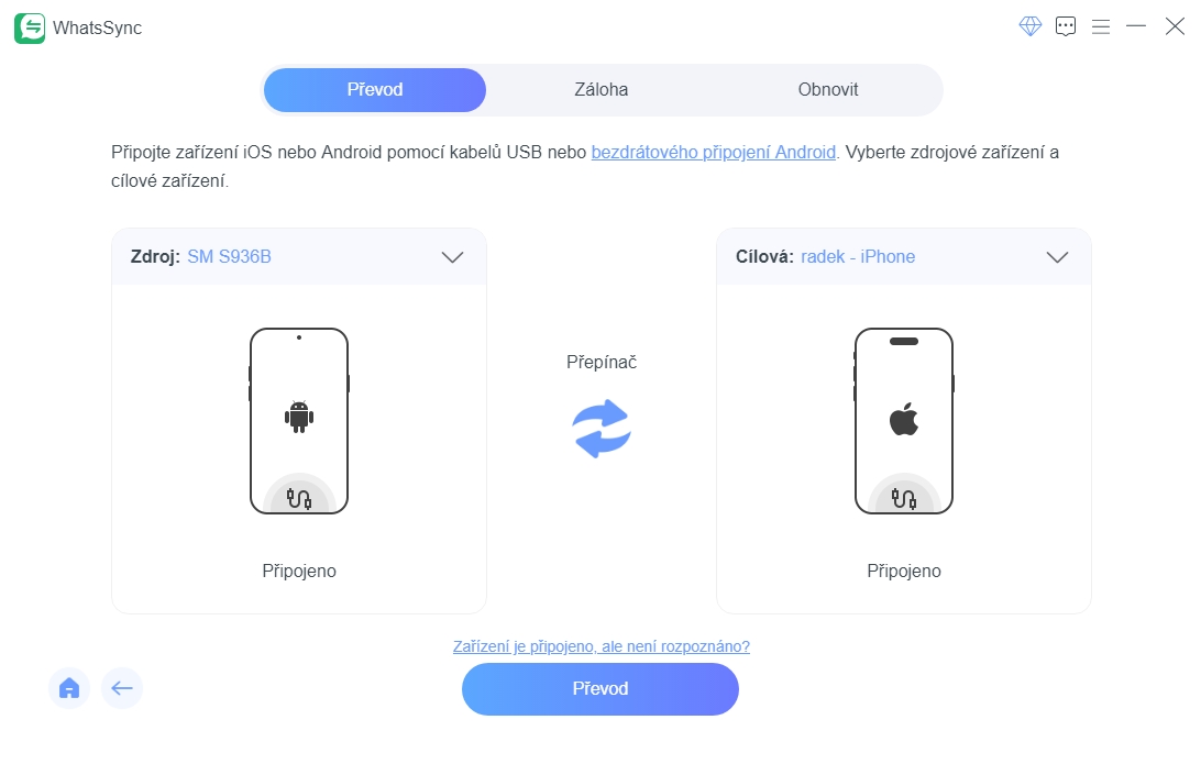 Důležitou funkcí aplikace Aiseesoft WhatsSync je přenos WhatsApp chatů, společně s fotkami, videi, hlasovými zprávami i dalším obsahem, do smartphonu na jiné platformě. Přenos funguje obousměrně – z Androidu do iOS i naopak.