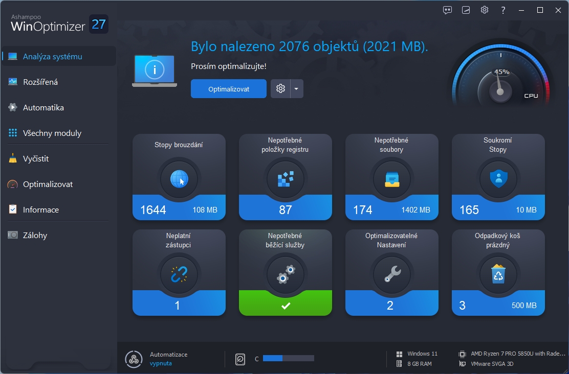 Ashampoo WinOptimizer nabízí v úvodním okně přehled aktuálního stavu počítače, společně s hlavními funkcemi na jeho kontrolu, vyčištění a optimalizaci. Po úvodní analýze stačí jen kliknout na volbu „Optimalizovat“ a Ashampoo WinOptimizer se už o vše postará.
