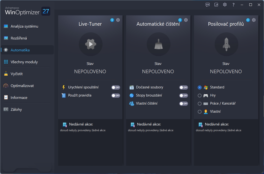 Nejvíce času a námahy vám ušetří funkce programu Ashampoo WinOptimizer na automatickou optimalizaci na jedno kliknutí. Stejně jako funkce v nabídce „Automatika“, kde je k dispozici automatické čištění, optimalizace v reálném čase nebo „Posilovač profilů“ pro dosažení maximálního výkonu.