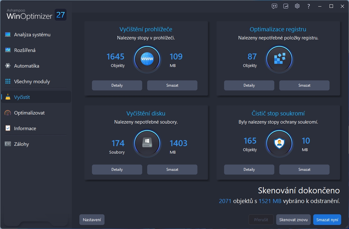 Ashampoo WinOptimizer 27 nabízí přehledné rozhraní s funkcemi pro čištění registru, mazání nepotřebných dat, zrychlení připojení k síti i ochranu soukromí. Správu počítače lze provádět ručně, s průvodci nebo zcela automaticky. Verze 27 výrazně posiluje právě automatizaci – modul „Automatické čištění“ pracuje na pozadí při ukončení aplikací a funkce „Vlastní čištění“ maže v pravidelných intervalech vybrané soubory. Vylepšený „Live-Tuner“ inteligentně upravuje priority procesů pro rychlejší spouštění programů. Nový „Posilovač profilů“ nahrazuje „Game Booster“ a umožňuje vytvářet profily optimalizace podle způsobu použití počítače. Další novinkou je „Analyzátor pádů“, který na základě chybových zpráv pomáhá identifikovat příčiny problémů se systémem. WinOptimizer 27 podporuje nejnovější verze Windows 11 i prohlížečů a vylepšená správa paměti zrychluje chod na 64bitových systémech.