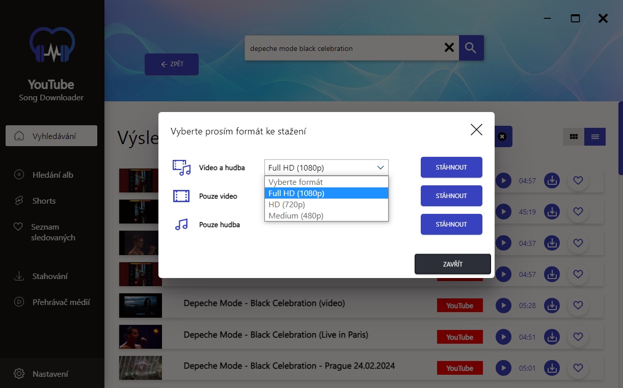 Před začátkem stahování můžete zvolit preferované parametry hudby a videa.