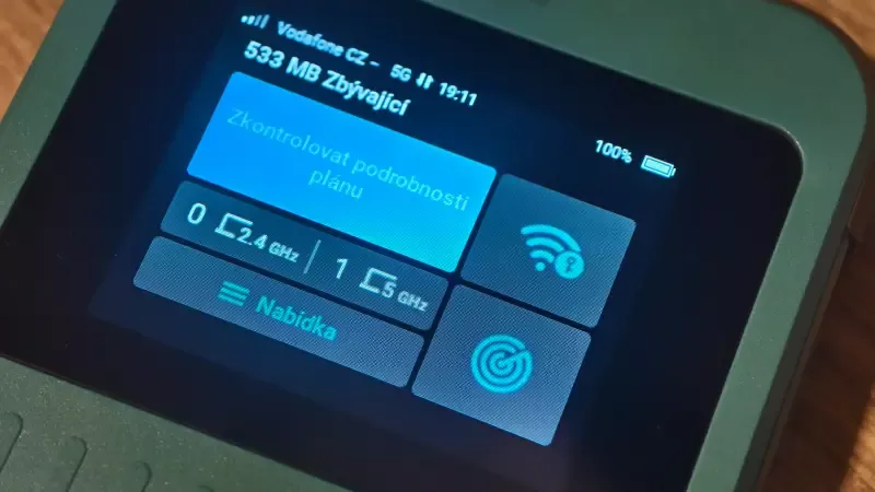 Zprovoznění routeru a nastavení Wi-Fi sítě je snadnější než nastavení smartphonu nebo domácího routeru. Prakticky stačí krabičku spustit, nastavit češtinu a počkat. Obě frekvence Wi-Fi mají přednastavená SSID a silná hesla, z mobilu se k nim můžeme připojit snadno přes QR kód. Komunikace je šifrována pomocí WPA3. My jsme pro test využili bonusový 1 GB dat služby SIMO, poté jsme přepnuli na klasickou nanoSIM s neomezeným datovým provozem. Instalace SIM karty nevyžaduje „šťouchátko“, takže kartu můžete vložit prakticky kdekoliv a bez nástrojů. V prodeji je jak základní verze bez datového balíčku, tak o cca 300 Kč dražší varianta s 20GB limitem SIMO a 20GB SIM kartou.