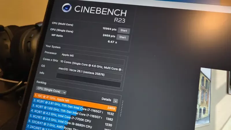 V reklamních materiálech Apple z dobrého důvodu raději používá srovnání výkonu nového procesoru M5 s veteránem M1. Silicon M5 je podle výrobce až šestkrát rychlejší například při lokálním zpracování úkolů AI, ovšem v době uvedení procesoru M1 se ještě o lokální umělé inteligenci v noteboocích téměř nemluvilo. Test Cinebench R23 ale ukazuje, že ačkoliv neobsahuje tolik výpočetních vláken, aby byl nejrychlejším procesorem pro osobní počítače na trhu, testovaný 10jádrový model procesoru M5 vykázal zdaleka nejvyšší výkon na jedno jádro.