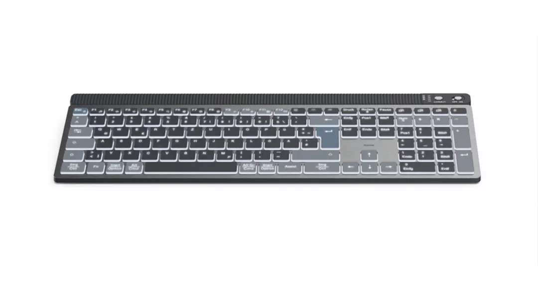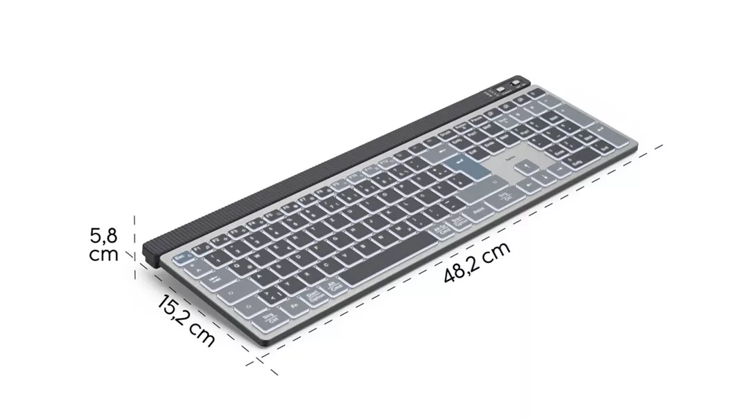 spodní straně necestuje po stole. Rámeček kolem kláves je hliníkový s nádechem modré barvy. Klávesnice má dvě úrovně podsvícení, které by ale mohlo být rovnoměrnější. Při práci po tmě je ale samozřejmě užitečné. Aby se integrovaný akumulátor nevybíjel zbytečně rychle, klávesnice se po 5 minutách automaticky vypne.