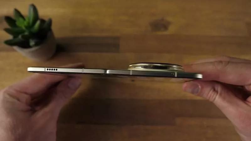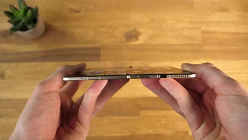 Stejně jako jeho loňský předchůdce, Honor Magic V3 (test najdete zde), nás zaujal Honor Magic V5 zejména sotva uvěřitelně tenkým tělem. S tloušťkou pouhých 4,1 milimetru v rozloženém stavu je šasi telefonu jen o něco tlustší než USB-C konektor a také stanovuje nový rekord v našich dlouhodobých srovnávacích testech smartphonů. Samsung Galaxy Z Fold7 je však se svými 4,2 milimetry v podstatě stejně tenký. Velký rozdíl tvoří blok fotoaparátů, který vyčnívá až do výšky 7,5 milimetrů nad záda Honoru Magic V5 a zvyšuje celkovou tloušťku Magic V5 až na 16,2 milimetrů.