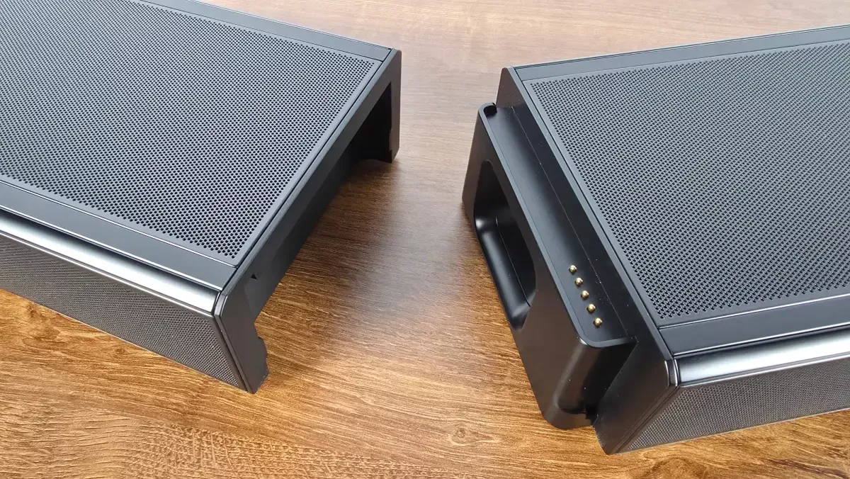 S rozměry 20,2 x 5,8 x 13,6 centimetrů a hmotností 1,3 kilogramu nejsou sice příliš mobilní, ale díky integrované baterii je lze odděleně od soundbaru používat několik hodin. Praktická je také možnost aktivace nočního režimu, ve kterém si můžete odpojený reproduktor přinést k posteli a potichu jej poslouchat bez aktivovaného soundbaru a subwooferu.