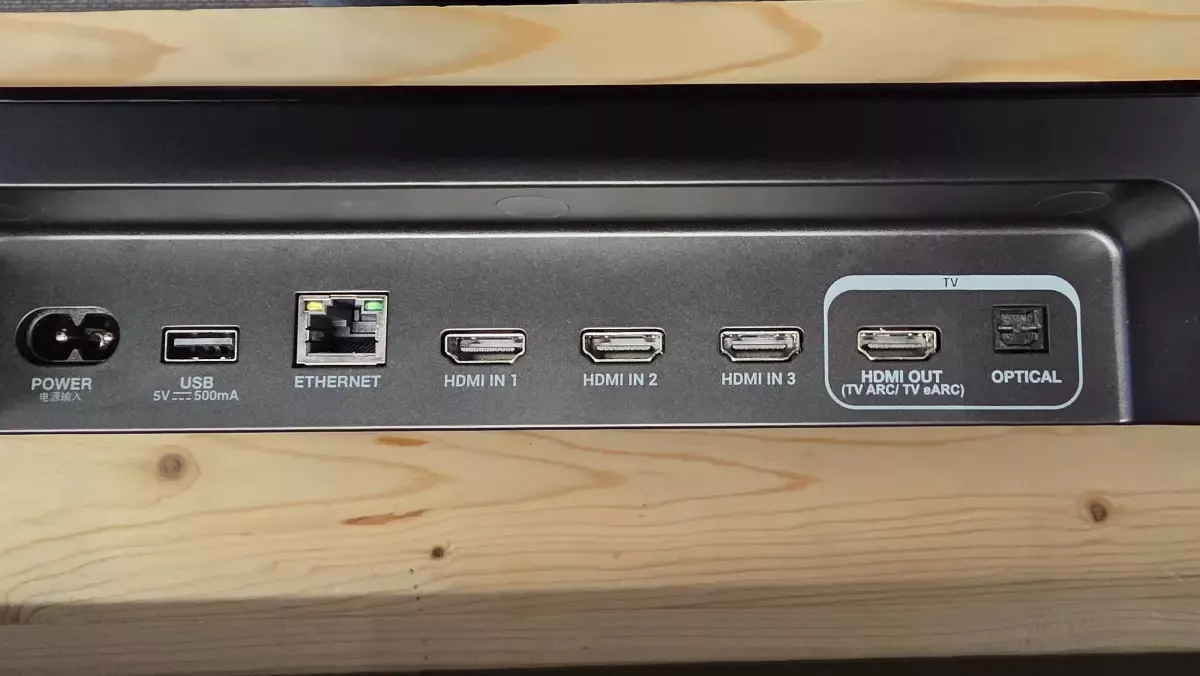 Samotný soundbar je možné s televizorem propojit buď přes HDMI, nebo přes optický audio vstup. Další zvukové zdroje, jako jsou konzole nebo streamovací přehrávače, se dají k JBL Bar 1300MK2 připojit také přímo přes tři HDMI vstupy. Soundbar navíc podporuje Bluetooth, Chromecast a AirPlay, ale chybí mu klasické analogové audio vstupy typu AUX a Cinch. V námi testovaném modelu nebylo možné použít USB port pro připojení lokální hudební sbírky, slouží pouze jako servisní port.