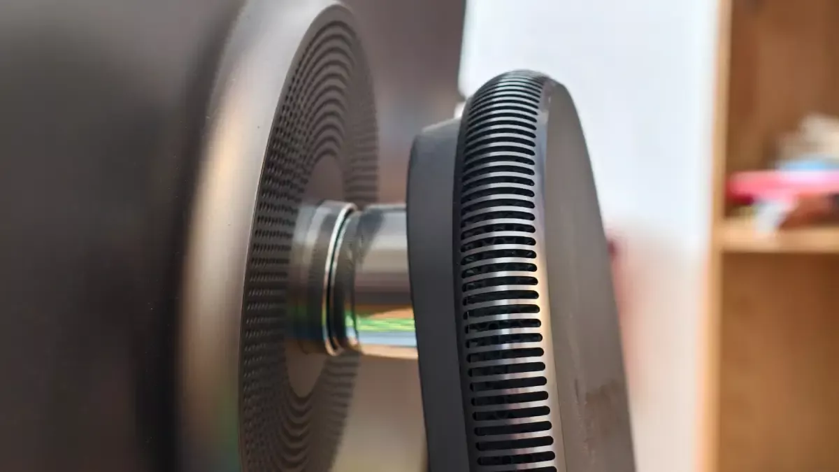 Na pravou stranu podstavce výrobce umístil vypínač, přepínač bezpečnostní krytky webové kamery a miniaturní joystick pro ovládání OSD menu (bohužel pouze anglicky a čínsky). Na levé straně je pak další dvojice 10Gb USB-A a USB-C konektorů, 3,5mm audiozdířku a přepínač volby zdroje videosignálu. Ten se hodí v případě, že budete chtít využít panel AiO počítače jako monitor pro připojení k notebooku nebo tabletu, k Lenovu Yoga AIO 27i lze připojit jeden externí zdroj videosignálu.