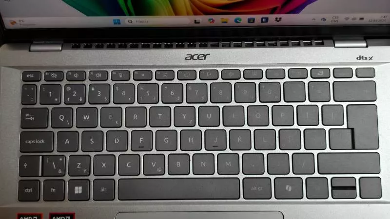 U displeje jsme se nejprve trochu zarazili, protože v této cenové kategorii většina modelů obsahuje OLED panel s bohatými barvami a dokonalým kontrastem. Takové displeje najdeme i v řadě Acer Swift, ale pro model 14 AI AMD výrobce zvolil IPS panel s rozlišením 1 920 x 1 200 bodů a dotykovým povrchem. Intenzita jasu se pohybuje okolo 400 cd/m2, což stačí na práci ve světlé místnosti, ale při venkovní práci je lepší vyhledat stinné místo. IPS panel má pouze standardní 60Hz obnovovací frekvenci.