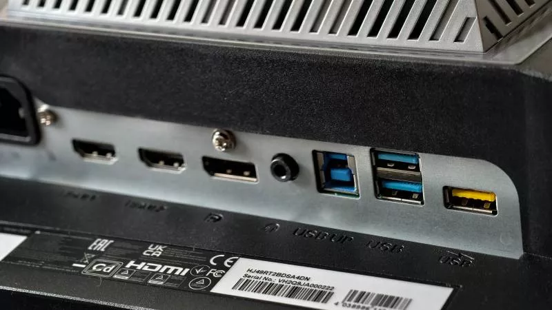 Monitor je osazen dvojicí moderních konektorů typu HDMI 2.1 v kombinaci s DisplayPortem 1.4, vedle kterých se nachází i USB-B/A rozbočovač se třemi 5Gb výstupními USB-A konektory. Díky HDMI 2.1 oba typy videokonektorů podporují ve 4K rozlišení 165Hz obnovovací frekvenci.