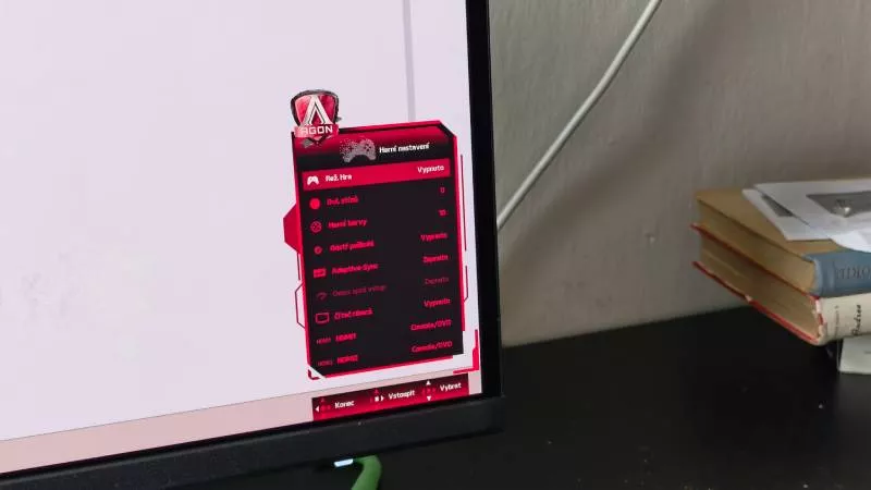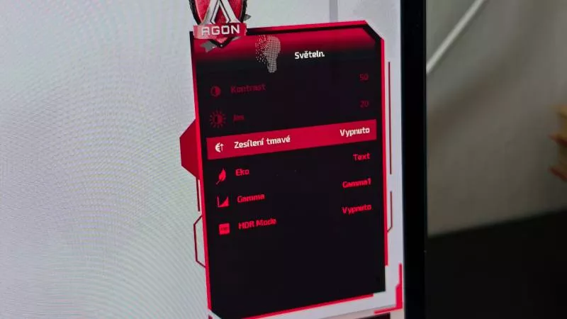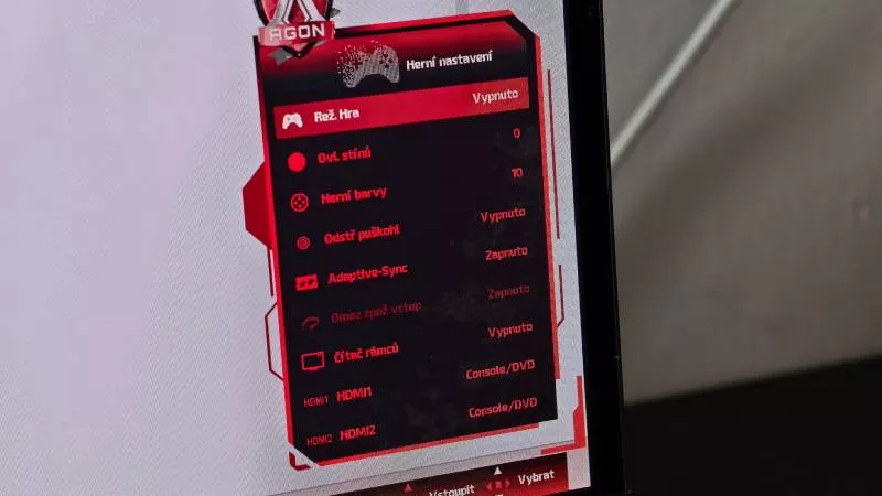 Ovládací menu je lokalizováno do češtiny a ovládá se snadno miniaturním joystickem, umístěným na zadní straně monitoru. Položky menu jsou ale zaměřené výhradně na hráče, přednastavené režimy pro kancelářskou práci výrobce umístil až do podsložky Světelná nastavení / Eko. K dispozici jsou mody standardní, text, internet, hra, film, sport a čtení (černobílý režim). V režimu hry se monitor přepíná mezi režimy FPS, RTS a závod, k dispozici jsou tři pozice pro individuální uživatelské režimy. Potěšila nás velmi dobrá kvalita dvou integrovaných 8W reproduktorů.