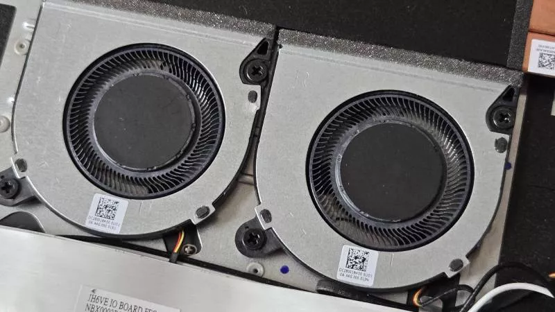 Spodní kryt notebooku s mohutnými gumovými nožičkami je uchycen 12 obyčejnými křížovými šroubky a jeho demontáž je otázkou okamžiku. Pod ním se nachází základní deska se snadno přístupnou baterií, dostatečně dimenzovaným chlazením procesoru a sloty pro M.2 SSD, Wi-Fi a BT adaptér. 16 GB RAM je ale napevno naletovaných na základní desku a volný slot pro upgrade není k dispozici.