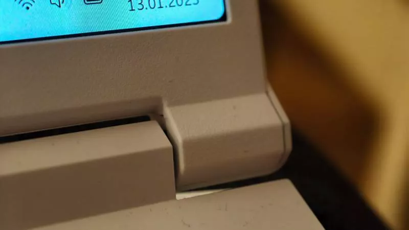 14,5” IPS displej s vysokým rozlišením je zasazen do rámečku, který má sice poměrně úzké hrany, ale působí pevně a kryt víka se neprohýbá, takže panel je dobře chráněn. Displejová část je k tělu notebooku spojena dvěma robustními klouby, které jakoby designově navazovaly na první přenosné počítače. Možná to je jen náš pocit, ale klouby se nám moc líbily.