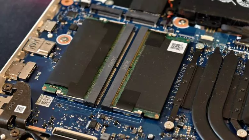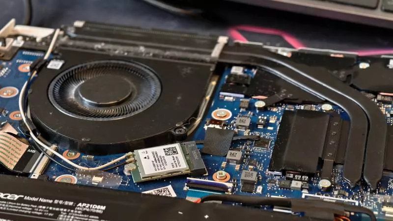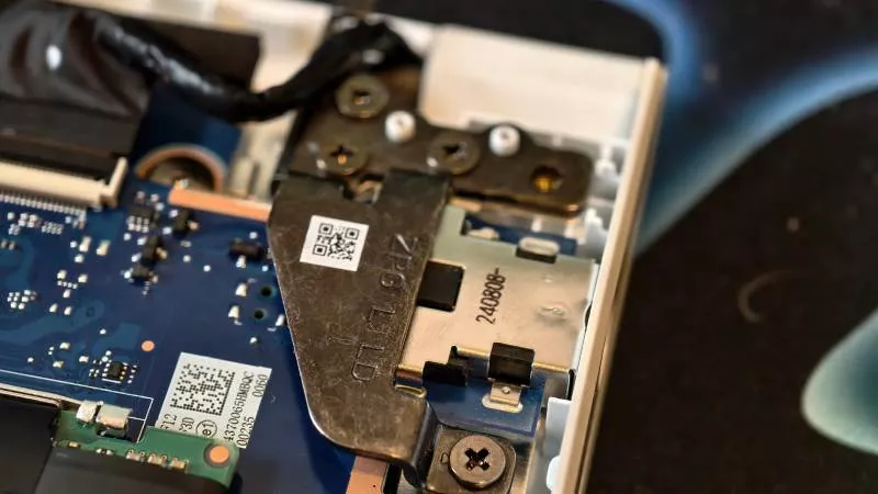 Spodní víko notebooku má bohatou ventilaci a devět obyčejných šroubků, takže se dá snadno otevřít i bez speciálních nástrojů, nenašli jsme na něm ale otvor pro reset baterie. Skvělá zpráva ale je, že po sejmutí spodního víka najdeme přístup ke dvěma DDR5 slotům a dvěma M.2 NVMe PCIe 4.0 slotům (jeden zaplněn systémovým diskem, druhý volný). RAM ani diskový prostor nejsou pevně naletovány na desku a uživatel si je může v případě potřeby časem upgradovat. Vyměnit lze snadno i Wi-Fi/Bluetooth modul a baterii. Klobouk dolů.