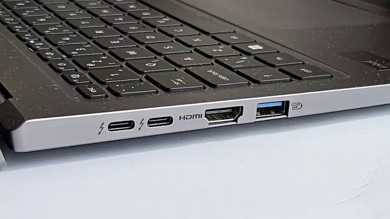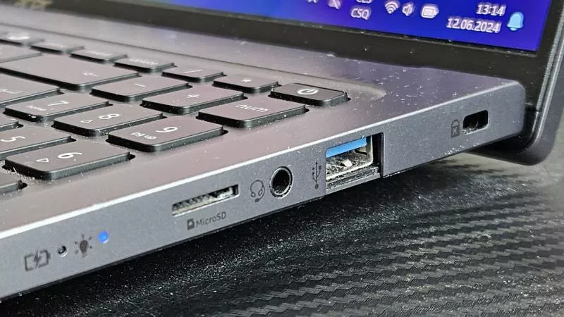 Portová výbava odpovídá výkonové a cenové kategorii, jsou zde dva plnohodnotné USB-C konektory s podporou dobíjení i přenosu videa (TB4), dva klasické USB-A 3.2 Gen1 konektory, HDMI 2.1, audiojack i slot pro paměťovou microSD kartu. Ani zde nenajdeme konektor pro připojení k LAN, nicméně existuje řada USB-C rozbočovačů nebo monitorů, které síťový konektor mají. Samozřejmě nechybí Bluetooth 5.2 a Wi-Fi 6E s podporou přenosů v obou pásmech. Velmi oceňujeme krytku webové kamery.