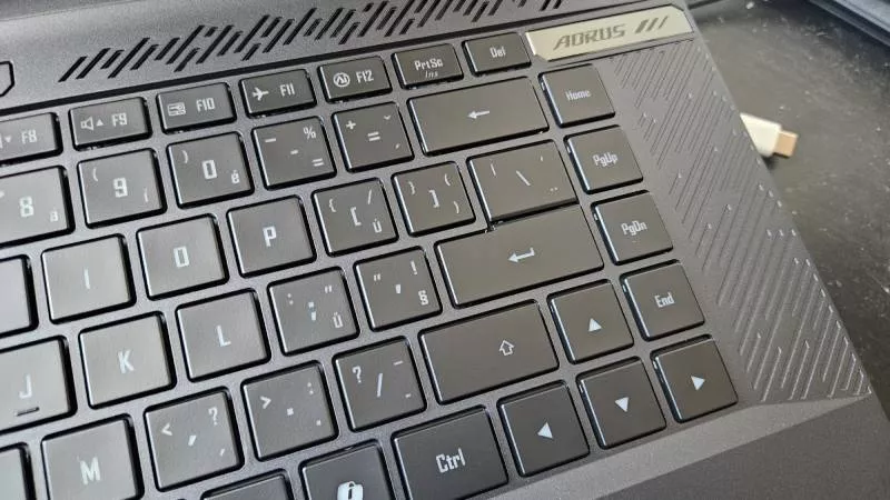 Rozložení klávesnice je přehledné, nevadil nám sloupec tlačítek Home, PgDn, PgUp a End, nacházející se napravo od středně velkého Enteru. Podsvícení klávesnice je čtyřstupňové, barvy a styl podsvícení lze regulovat v doprovodné aplikaci Gigabyte Control Center, ovšem nelze snížit intenzitu jasu sedmi průhledných kláves, které v noci poměrně značně zatěžují oči.