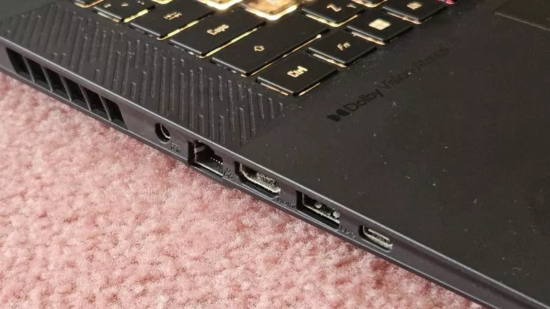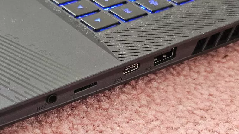 Do těla notebooku se vešly plnohodnotné porty LAN a HDMI 2.1, nechybí samozřejmě ani dva USB-A konektory a přítomné jsou i dvě USB-C zdířky s podporou přenosu videa i dobíjení. Mimo toho je na boku notebooku i slot pro microSD kartu a klasický 3,5mm audio konektor.