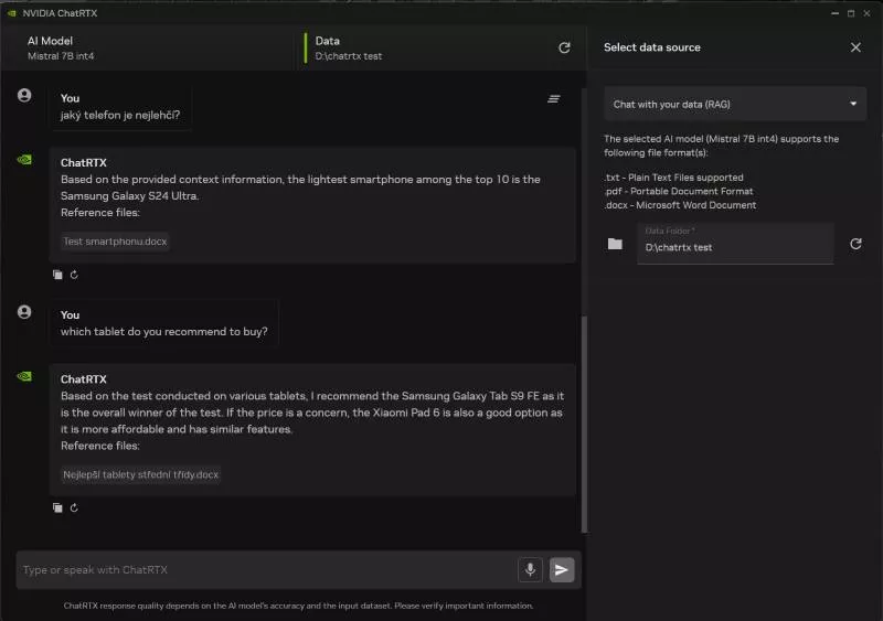 Nejnovější řada grafických karet NVIDIA umožňuje pracovat s lokálně umístěnou umělou inteligencí ChatRTX. Nejprve je nutné stáhnout poměrně rozsáhlý datový balíček ze stránek NVIDIA a nainstalovat jej do notebooku. Po spuštění jsou uživatelům k dispozici jazykové modely pro práci s dokumenty a obrázky, ale zajímavá je možnost nechat AI pracovat s lokálními daty v notebooku.