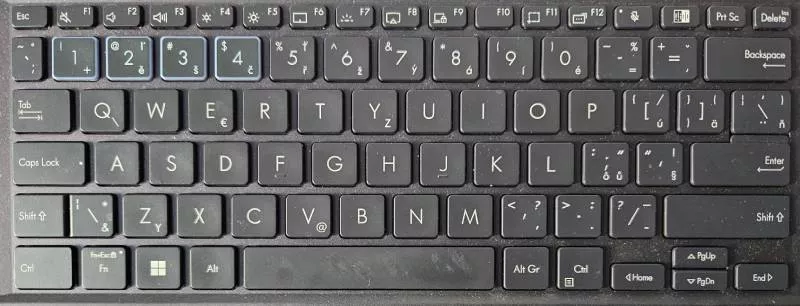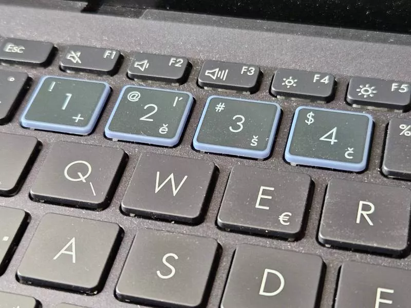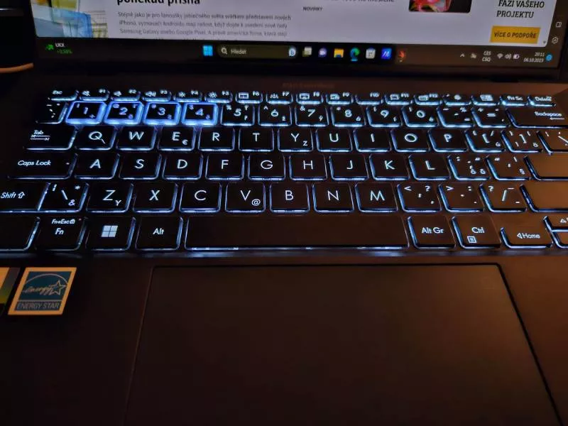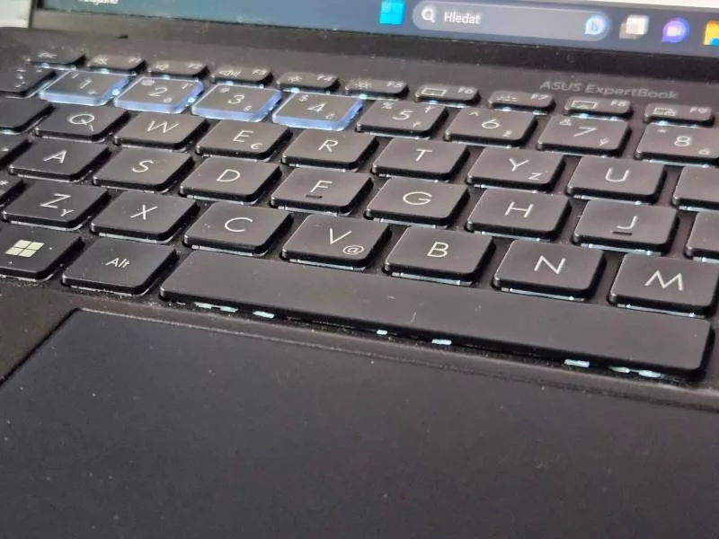 Klávesnice nás příjemně překvapila. Na malých noteboocích se většinou nepíše moc dobře, ale to není případ Asusu ExpertBook B9 OLED. Tlačítka o velikosti 15,6 x 14,7 mm mají 1,5mm stisk, přesnou hmatovou i poměrně hlasitou zvukovou odezvu. To může někomu vadit, ale pisatel má v tomto případě naprostou jistotu stisku. Rozložení klávesnice je střídmé, nenajdeme tu žádné extravagance, jen čtyři numerická tlačítka 1-4 mají průsvitné hrany a v noci zbytečně září. Podsvícení klávesnice je také pouze jednostupňové. Potěšila nás konstrukce klávesnice, která podle výrobce odolá vylití 400 ml čisté vody.