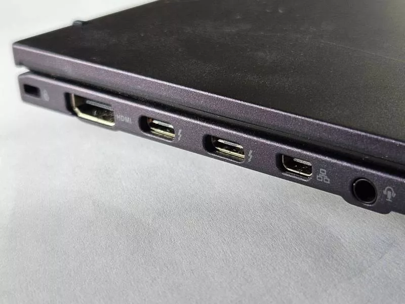 Tělo notebook má v zavřeném stavu tloušťku 16 mm a po otevření měří klávesnicová část na výšku jen 10 mm. Přesto se do boků notebooku vešel plnohodnotný HDMI 2.1 konektor i jeden velká USB-A 3.2 Gen2 port. Na levém boku pak najdeme ještě dva USB-C konektory s podporou dobíjení a přenosu videa (Thunderbolt 4), vedle nich se nachází konektor pro připojení redukce k LAN a 3,5mm audiokonektor. Na pravém boku je vypínač s integrovanou čtečkou otisků prstů.