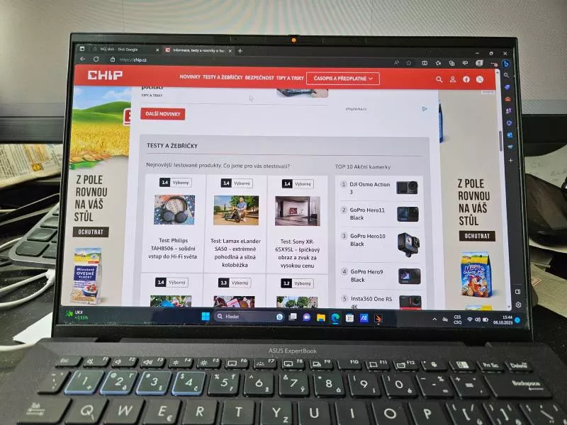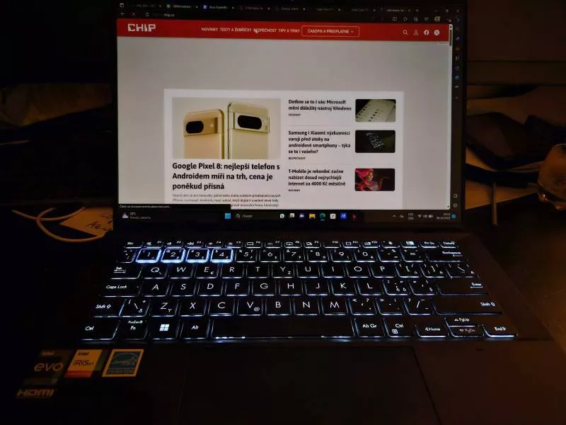 Intel Core i7-1355U používá desetijádrový procesor se dvěma výkonnými jádry opatřenými Hyper Threadingem s maximální frekvencí 5.0 GHz a osmi efektivními jádry na maximální frekvenci 3,7 GHz. V kombinaci s 16 GB RAM typu LPDDR5 a slušně výkonným NVMe SSD diskem (4 206 MB/s při čtení, 2 326 MB/s při zápisu) notebook naprosto plynule zvládá chod běžných kancelářských aplikací, ale neztratí se ani v našich náročných výkonnostních testech.