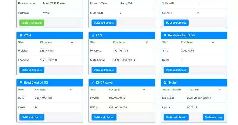 Propojení obou routerů do režimu Mesh proběhlo automaticky, protože je při instalaci zvoleno jako výchozí možnost, obě krabičky lze ale zapojit i do režimu Mesh Access Point, Wireless Extender nebo WISP (připojení domácí sítě k jiné prostřednictvím jediné IP adresy).