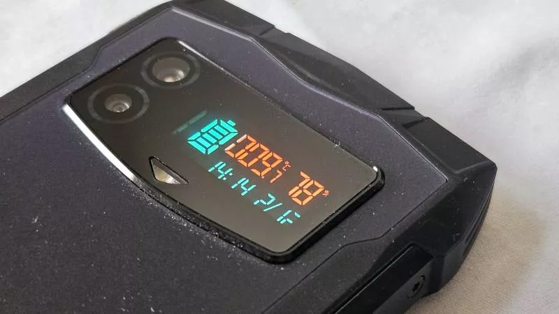 Displeje jsou na telefonu dva, na zádech je totiž vedle fotoaparátu dvouřádkový OLED displej, který ale zobrazuje pouze venkovní teplotu a vlhkost vzduchu na prvním řádku a datum a čas v řádku druhém. Vedle je pak umístěna ikona informující o zbývající kapacitě baterie. Údaje si telefon načítá z internetu, vnitřní snímač teploty a vlhkosti okolí telefon Smini nemá.