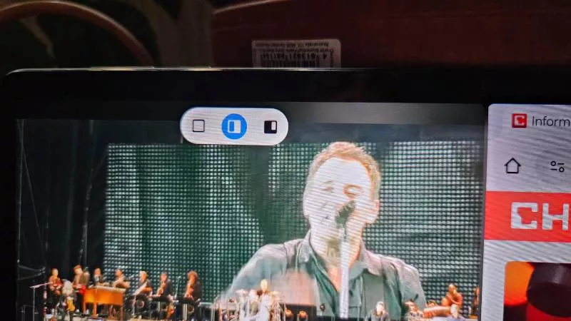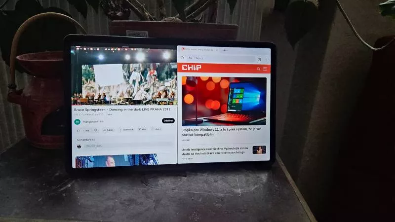 Díky velmi širokoúhlému obsahu lze na tablet pohodlně umístit dvě okna vedle sebe, takže lze zároveň sledovat filmy a pročítat webové stránky nebo elektronickou poštu. Rozdělení oken provedete ťuknutím na čárku uprostřed horní strany okna a na výběr máte ze dvou stejně velkých oken, umístěných na šířku vedle sebe, případně z vloženého okna.