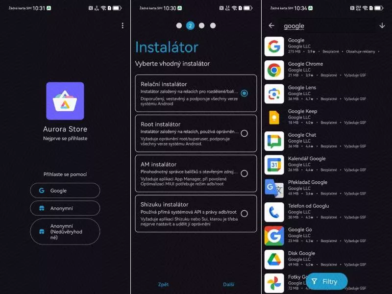 Aplikace jak od Googlu, tak i od jiných poskytovatelů lze do telefonu stáhnout například přes obchod "Aurora Store". Instalaci tohoto obchodu ale doporučujeme provést přes .apk staženou z počítače, protože mobilní verze se neustále snaží podloudně získat vaše telefonní číslo. Jakmile jej zadáte, máte zaděláno na problém s pravidelnou odchozí platbou 99 Kč za týden. Instalaci .apk aplikací přes alternativní obchody bychom rozhodně nesvěřili dětem.