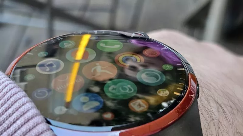 Kromě titanového designu zaujme na první pohled ohromný kulatý OLED displej 1,5” úhlopříčkou a rozlišením 466 x 466 pixelů (311 ppi). Tak velký displej zajišťuje skvělou čitelnost pložek menu i přijatých oznámení, na která lze dokonce reagovat pomocí klávesnice. Zakřivené krycí sklo nemá žádnou praktickou funkci, ale dodává hodinkám elegantnější vzhled.