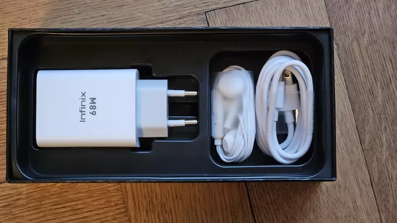 Infinix Note 30 VIP má v balení 68W napájecí adaptér, který doplní telefon na 50 % za půl hodiny a na 100 % prakticky za rovnou hodinu. Na dnešní dobu je to stále velmi dobrá hodnota, skvělá zpráva je, že dodávaný adaptér s rozměry 60 x 48 x 29 mm a hmotností jen 110 gramů dokáže nabíjet i notebook.