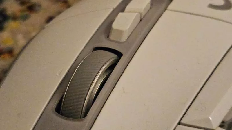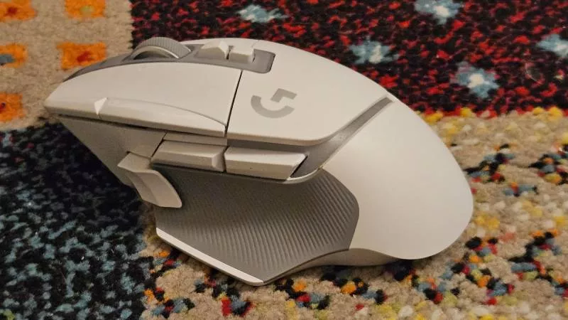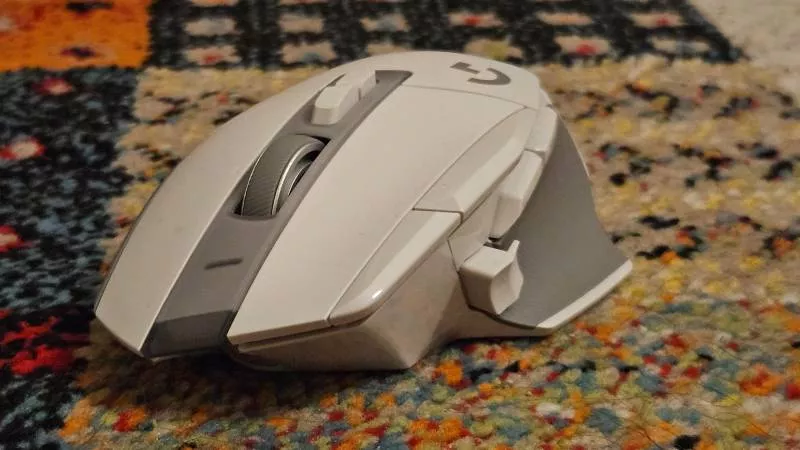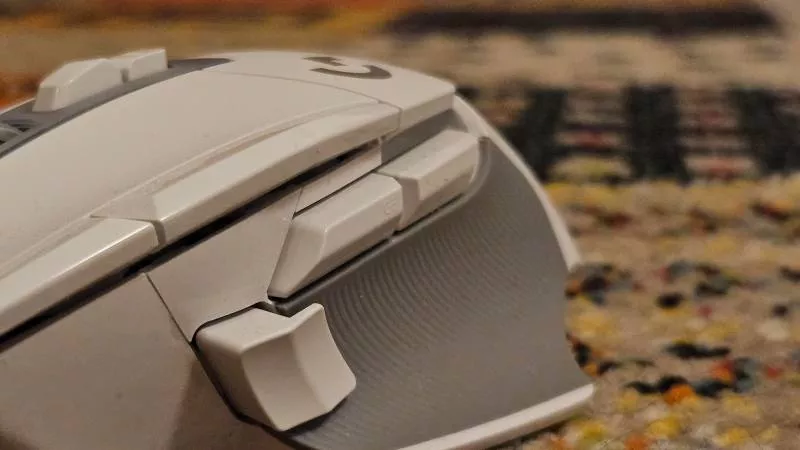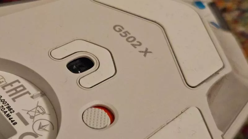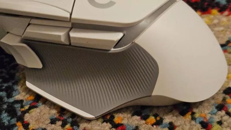Zdrsnělý povrch myši Logitech G502 X Plus v prostoru pod palcem