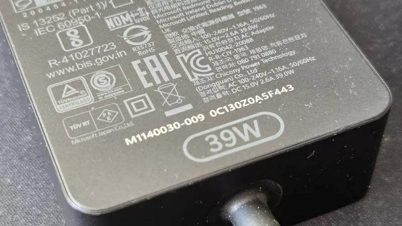 Součástí dodávky je malý a lehký napájecí adaptér (90 x 50 x 22 mm, 152 gramů) s magnetickou Microsoft koncovkou a výkonem 39 W, jejímž prostřednictvím se 53Wh baterie nabije za 30 minut na 36 %.K předchozím modelům Surface Pro se dodával o 70 gramů těžší adaptér o výkonu 65 W, se kterým se Surface 11 Pro dobíjí rychleji.