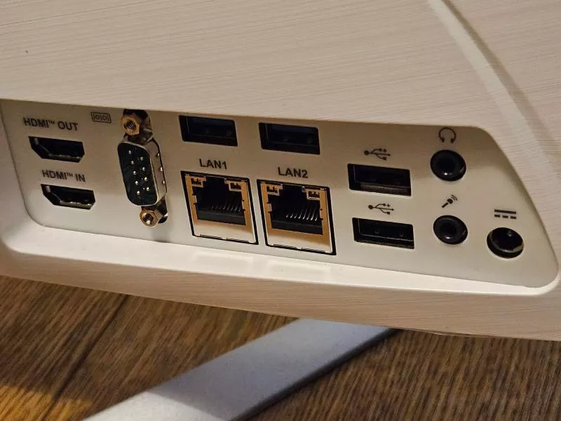 Portová výbava je slušná, dokonce se zde nachází jeden z hlavních důvodů proč si tento počítač pořídit. Kromě moderního portu USB-C (USB 3.2 Gen1) je na počítači i pětice USB-A zdířek (1x USB 3.2 Gen2, 2x USB 3.2 Gen1, 2x USB 2.0), dva HDMI porty, z nichž jeden je výstupní a slouží k rozšíření pracovní plochy počítače na druhý monitor a druhý vstupní, takže AIO počítač lze použít i jako externí displej notebooku. Pak jsou zde dokonce dvě gigabitové LAN zdířky pro připojení k internetu a nechybí dva audiokonektory pro připojení reproduktoru a mikrofonu. Samozřejmě nechybí adaptéry Wi-Fi 802.11ac a Bluetooth 5.0.