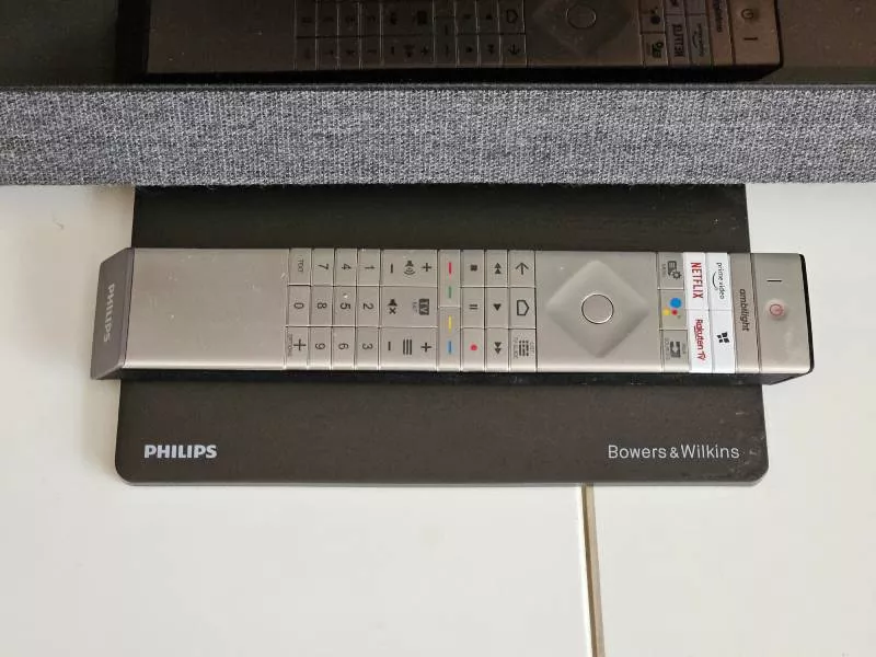 Ovládání zajišťuje velký podsvícený dálkový ovladač s dedikovanými tlačítky pro nejdůležitější služby, jako je například Amazon Prime Video nebo Netflix. Záda ovladače jsou překryta umělou kůží a příjemně se drží v ruce. Podsvícení se aktivuje automaticky, jakmile dálkový ovladač vezmete do ruky.