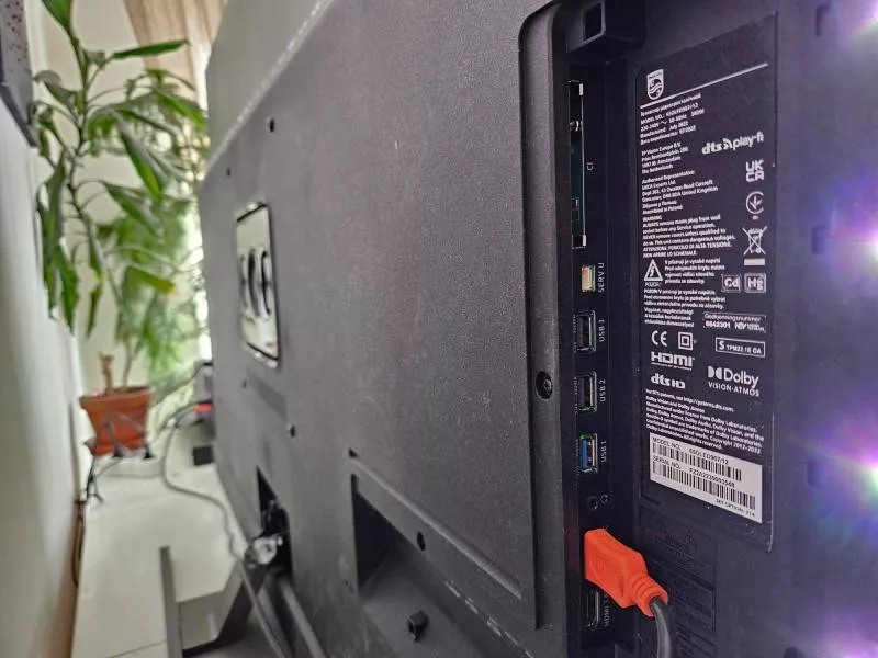 Na zadní straně se nachází klasická portová výbava v podobě CI slotu, tří USB portů, zdířky pro sluchátka a vedle celkem čtyř HDMI vstupů je zde také digitální audio výstup a konektor pro připojení do LAN. Dva ze čtyř HDMI vstupů podporují všechny funkce HDMI 2.1, jako je 4K/120 Hz, VRR, ALLM a eARC. Moderní televizor již nemá komponentní vstup ani Scart, ovšem nemůže chybět digitální tuner pro příjem satelitního, kabelového nebo terestriálního vysílání. Tunery umožňují nahrávání na USB, ale jńejsou zdvojené, takže během nahrávání nemůžete současně sledovat žádný jiný program.