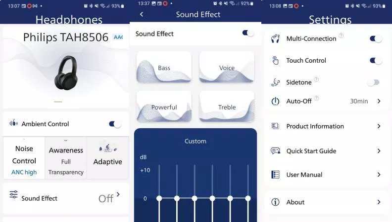 Sluchátka spolupracují s mobilní aplikací Philips Headphones, což je skvělá zpráva, protože pomocí aplikace lze upgradovat firmware, nastavovat ekvalizér či upravovat ovládání. V aplikaci je možné aktivovat spojení se dvěma zařízeními i vypnout nebo zapnout dotykové ovládání sluchátek. Hodně důležitá je položka, která upravuje automatické vypnutí sluchátek při nečinnosti.