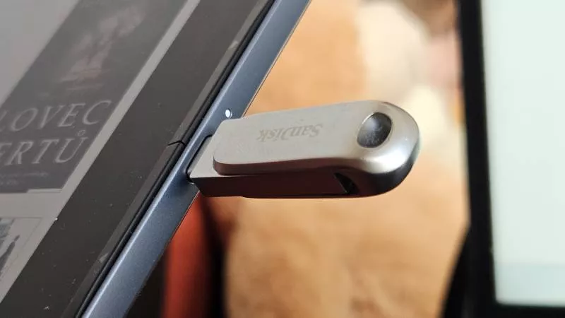 Vnitřní 32GB úložiště má dostupnou kapacitu cca 28 GB, takže nevadí, že jej nelze rozšířit paměťovou kartou. 28 GB bohatě stačí na tisíce textových knih a ještě zbyde místo na stovky audiotitulů. V případě potřeby lze použít USB-C flash disk, ze kterého lze přehrávat i hudební soubory. Během testu jsme bez problému používali USB-C disk s kapacitou 128 GB, naformátovaný na FAT32.