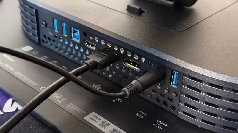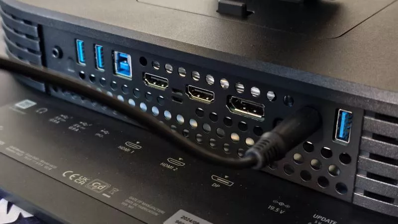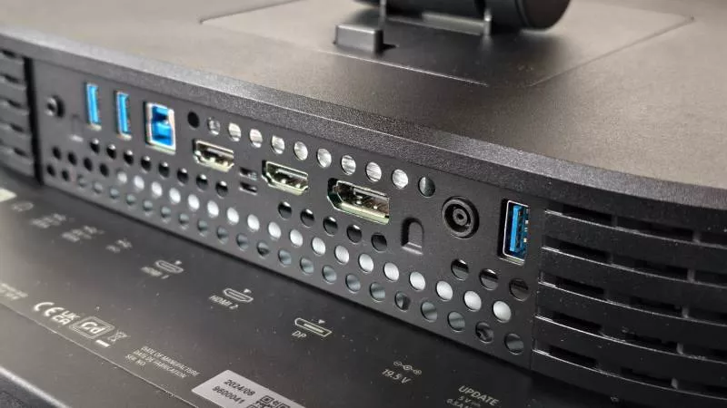 Na spodní části oválného bloku se nachází řada portů, obsahující dva HDMI 2.1 a jeden DisplayPort 2.1 konektory, vedle nichž je ještě USB rozbočovač typu USB-A/B se dvěma výstupními porty USB-A a jedním vstupním USB-B. K dispozici je ještě jeden USB-A konektor, který ale slouží pouze pro upgrade firmwaru. Bohužel se zde nenachází moderní USB-C konektor pro přenos dat, videa a případné dobíjení připojeného notebooku. Ano, Inzone M10S je primárně herní monitor a hráči USB-C moc nepoužívají, ale za tu cenu bychom jej čekali. Mezi porty monitoru najdeme dále 3,5mm audiozdířku, která však slouží pouze pro připojení sluchátek, monitor nemá vlastní integrované reproduktory.