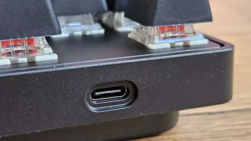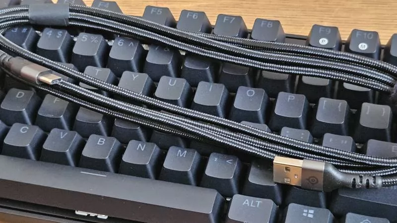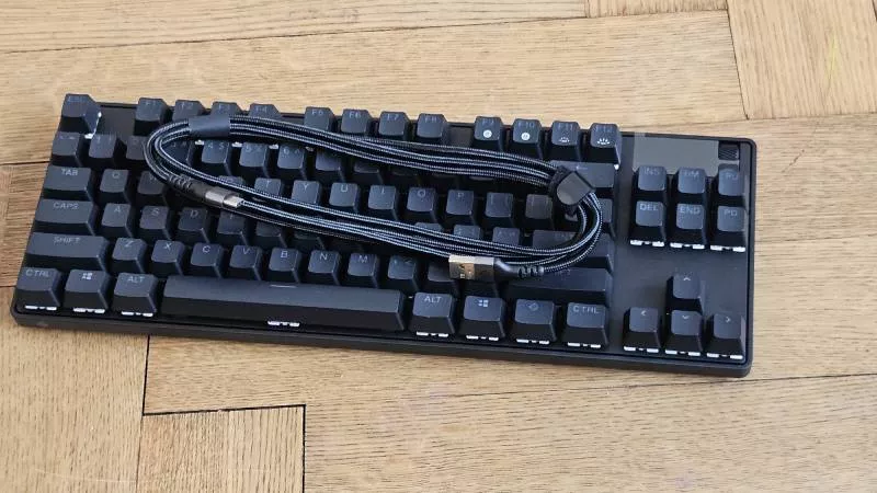 Testovaná verze klávesnice Apex pro TKL se k počítači připojuje pomocí 220cm odnímatelného USB-A/C kabelu, který je součástí dodávky, ale existuje i varianta s bezdrátovým připojením. V balení dále najdeme podložku pod zápěstí a nástroj pro výměnu tlačítek. Náhradní tlačítka ale v krabici nejsou.