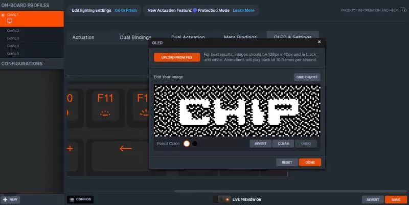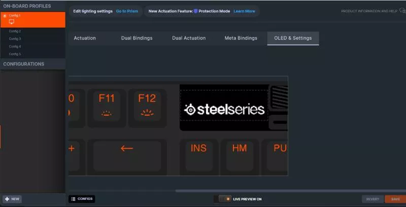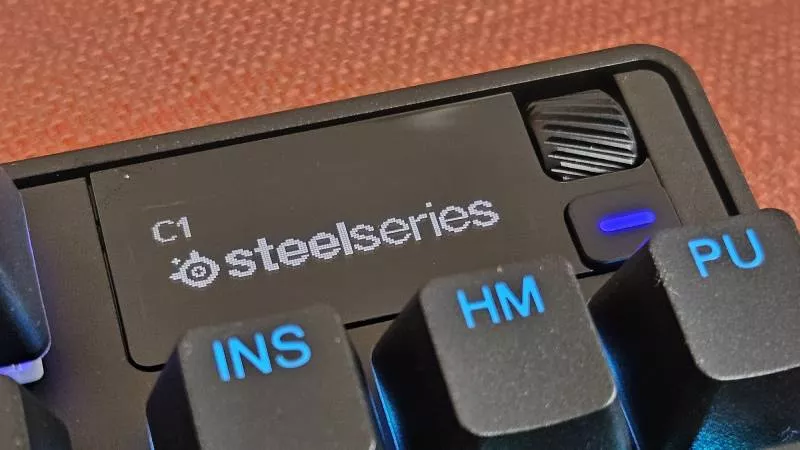 Specialitou řady Apex Pro je tradičně i OLED displej, umístěný v pravém horním rohu. Kromě toho, že si na něm můžete v programu SteelSeries GG vytvořit vlastní obrázek (dá se i nahrát JPEG), tak se dá displej použít i pro rychlé nastavení funkcí klávesnice.